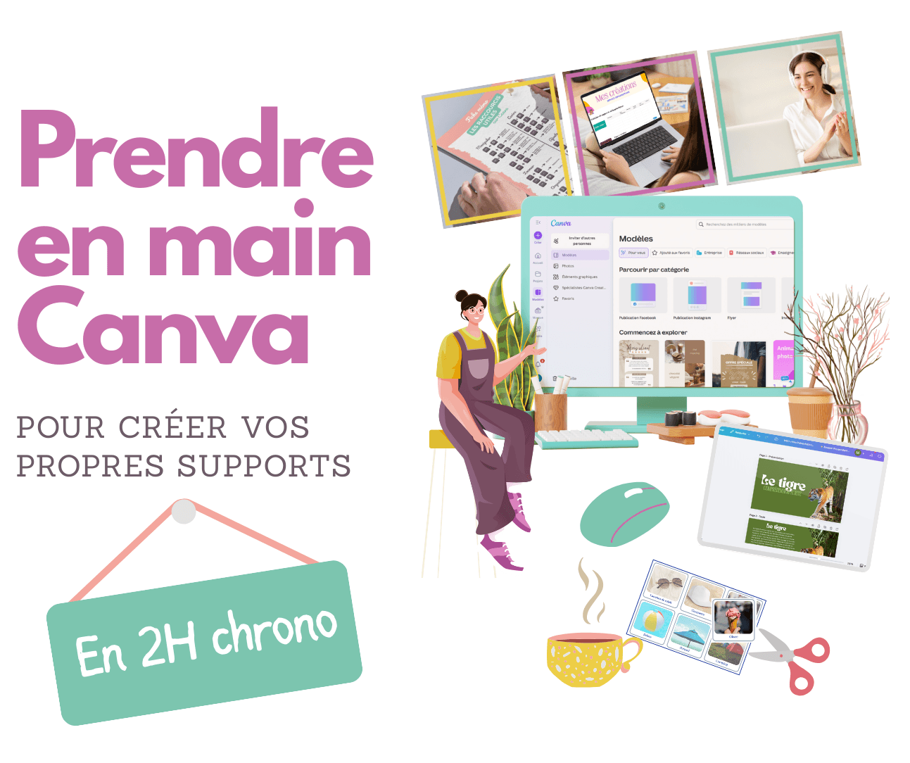 En moins de 2 heures, apprenez à utiliser Canva pas à pas pour créer des supports beaux, clairs et fonctionnels… même si vous n’êtes pas à l’aise avec l’informatique.